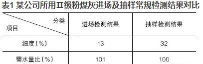 優(yōu)質(zhì)的粉煤灰摻入混凝土可明顯地改善混凝土的和易性,當粉煤灰摻量大于膠材總量的5%~10%時,效果極為明顯。現(xiàn)今在混凝土實際生產(chǎn)中,粉煤灰摻量往往達到20%,有的甚至高達30%,但混凝土的和易性卻不盡人意。抽取原材料進行檢測時,發(fā)現(xiàn)粉煤灰的檢測結(jié)果經(jīng)常不滿足標準要求或者與驗收時的結(jié)果相差甚遠。現(xiàn)以某公司所用Ⅱ級粉煤灰進場及抽樣常規(guī)檢測結(jié)果進行對比,見表1。