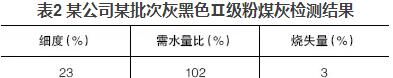 混凝土公司大多數(shù)使用的粉煤灰顏色與水泥相近,多呈灰色;也有部分粉煤灰顏色較深呈灰黑色,這種粉煤灰一般細度較細或含碳量較高。但總會發(fā)現(xiàn)一些深顏色的粉煤灰檢測結(jié)果與常理不符,如某公司某批次灰黑色Ⅱ級粉煤灰檢測結(jié)果見表2。