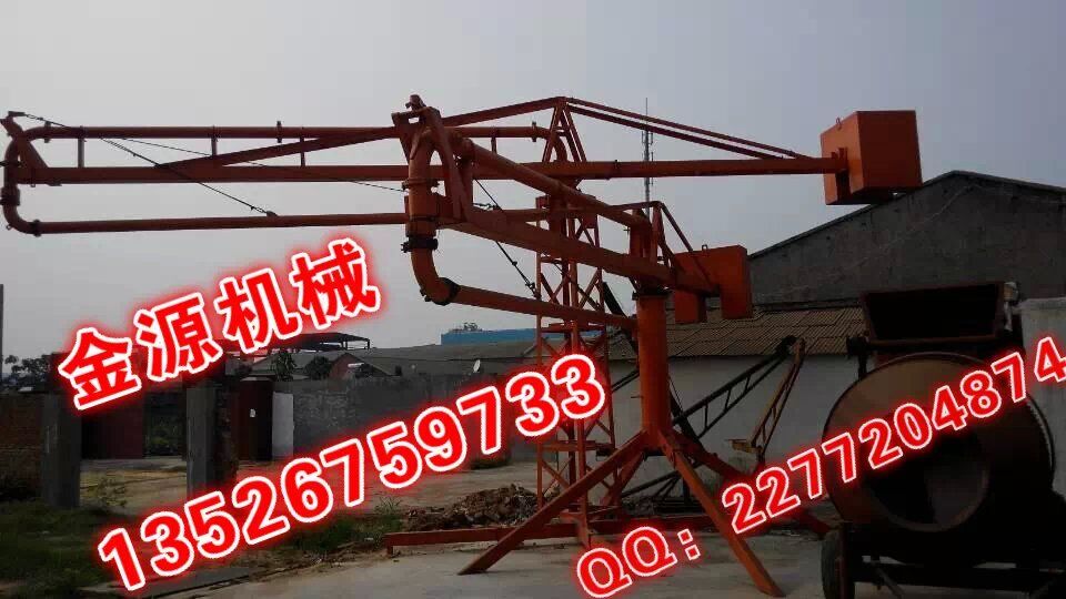 河南金源布料機桿采用回轉,臂架式布料結構,配用125MM輸送管,360度回轉,整機手動操作。具有結構簡單,強度、剛性可靠,操作簡單,靈活,維修方便等特點,與混凝土泵配套使用可廣泛的應用于民用與工業建筑的混凝土澆注工程中